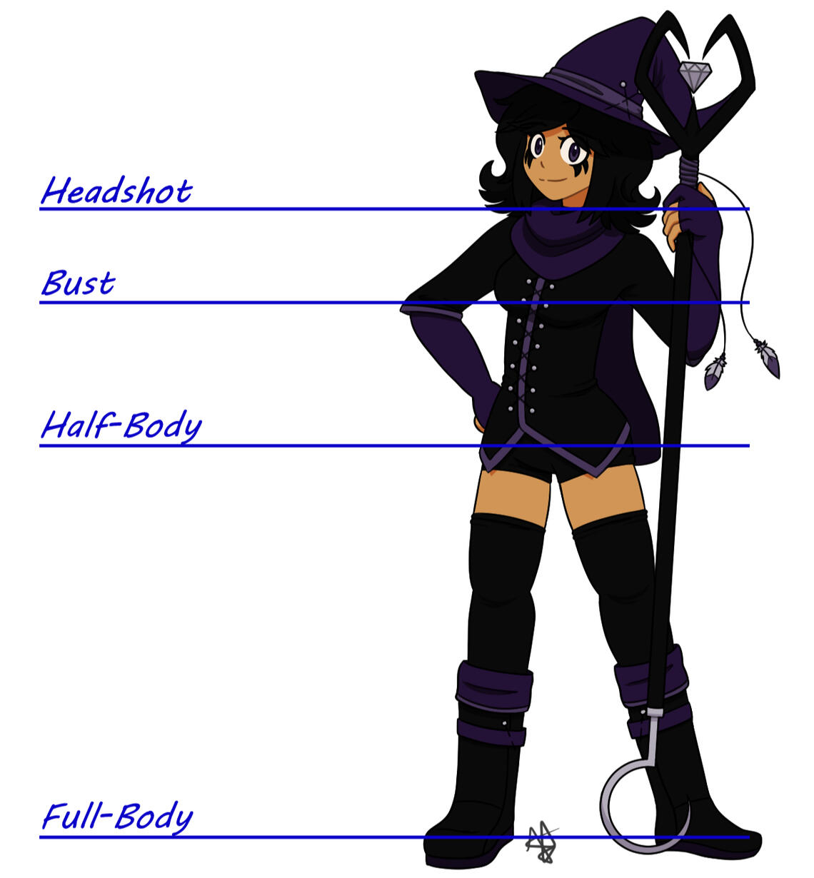 If you are confused about what headshot, bust, half body, or full body mean for my style, please consult my reference diagram: